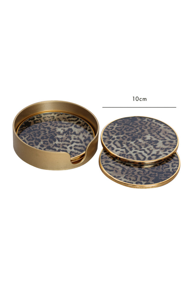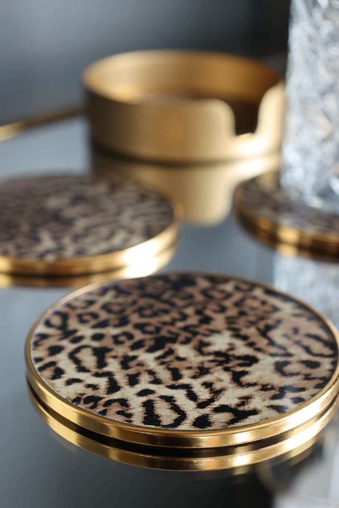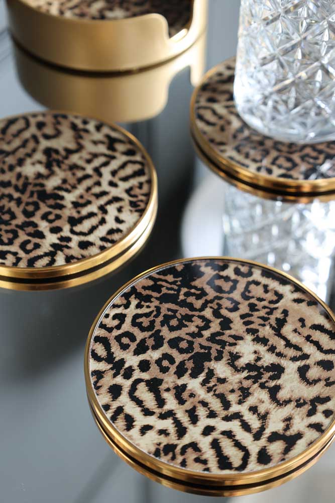 Bring a rock ‘n’ roll flair to your table settings with the Set Of 4 Leopard Print Coasters. Fiercely fabulous, this set of 4 glass coasters feature a glamorous leopard print design with a sleek gold rim and a gorgeous gold coaster holder. A stylish way to incorporate colour, pattern and attitude onto your tablescapes, these round glass coasters will protect your surfaces from ring marks while elevating the decor with exotic beauty.
