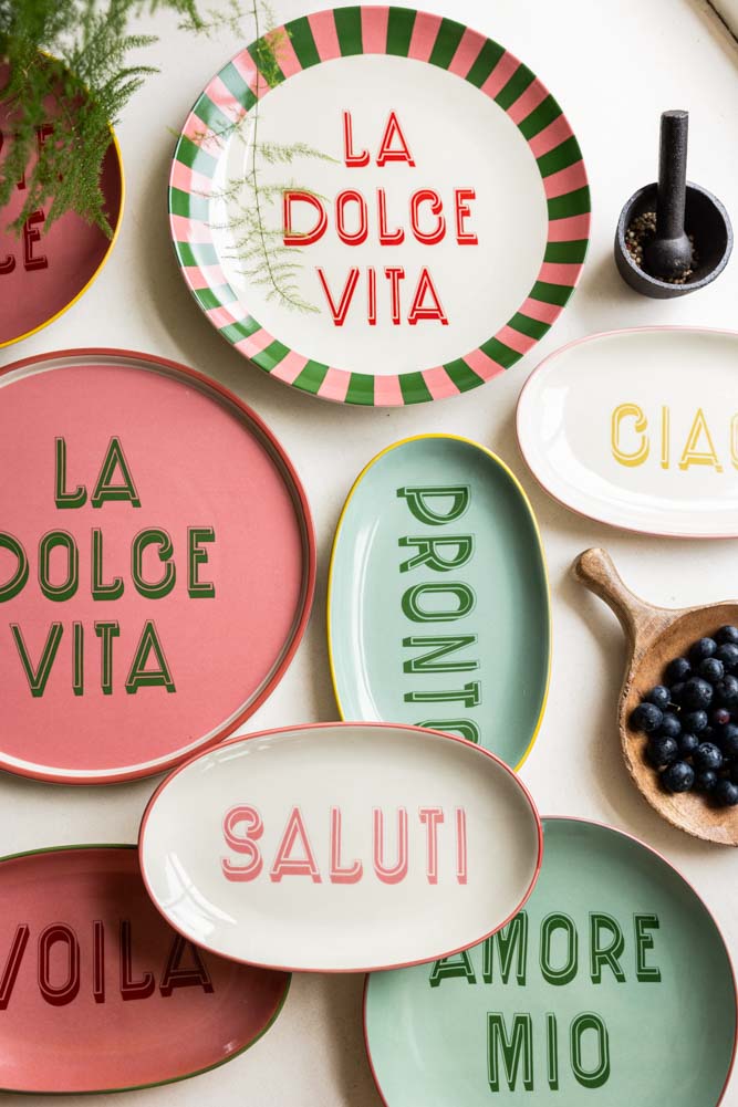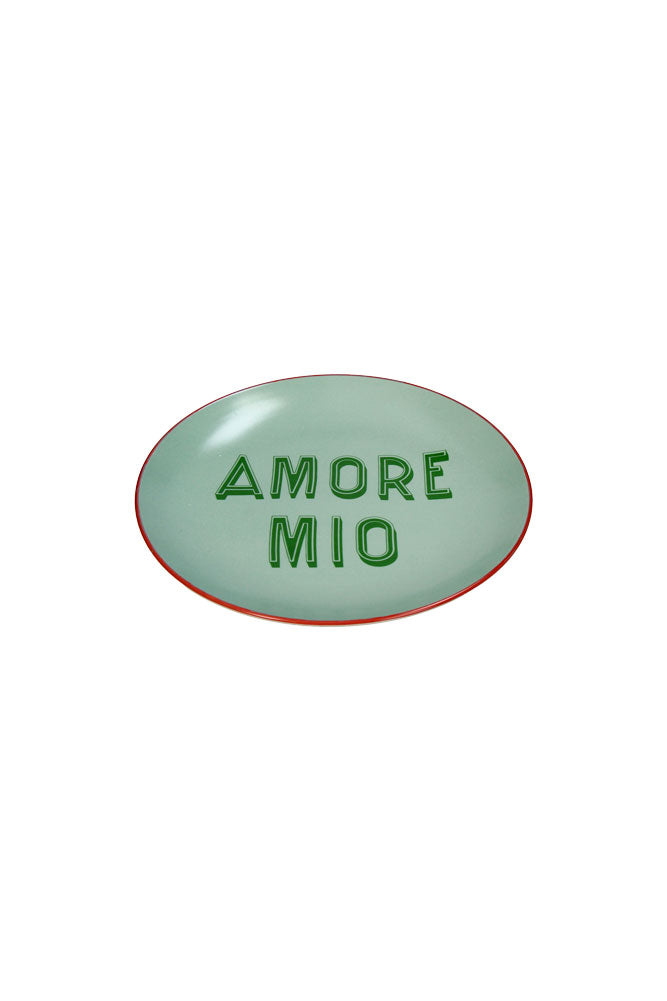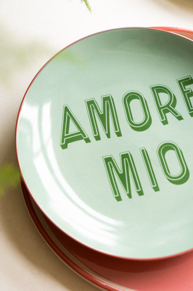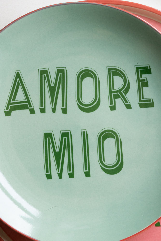 The Mint Green Amore Mio Plate is a wonderful fusion of charm and sentiment, featuring the phrase ‘Amore Mio’ ('my love') in a vibrant green art deco-esque text that pops out of a refreshing mint green background. The plate is finished in an hot pink border, which makes it our favourite colour combo, and is the perfect piece for romantic dinners and gatherings where you feel the need to spread a little love. Bring affection and joy to your table and celebrate the spirit of togetherness with this fun kitchen essential that brightens up mealtimes a treat. Gorgeous.