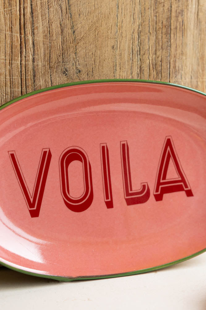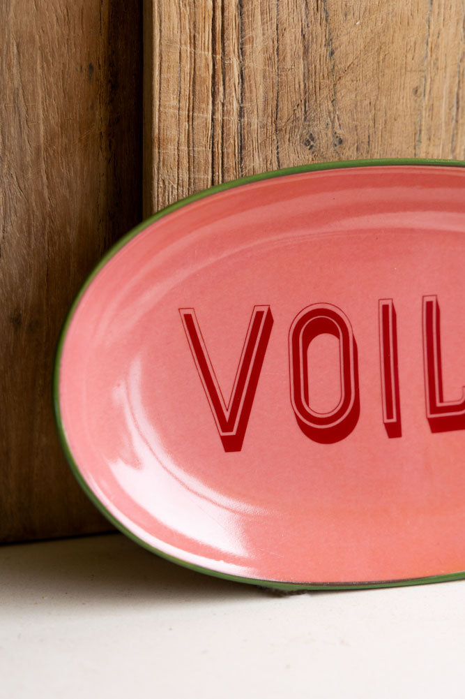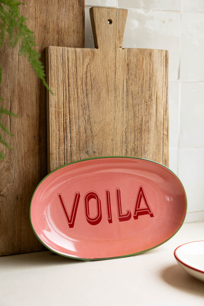 Introducing the Pink Voila Plate, which showcases a blend of romance and elegance perfectly. Crafted to take on a wonderful pink hue, the word ‘Voila’ written in the centre of the plate in bold red lettering introduces your meal beautifully, with the fresh green detailing around the rim creating a striking colour contrast. It’s perfect for showcasing your favourite culinary creations, and there's a sense of playfulness to this piece that makes it particularly apt for desserts. Add a pop of pink personality to your kitchen or dining table and wait for the compliments to roll in!