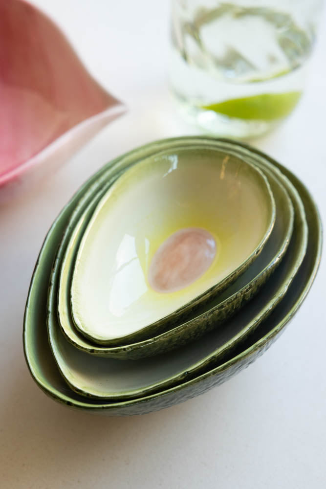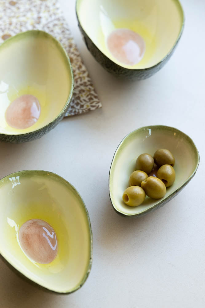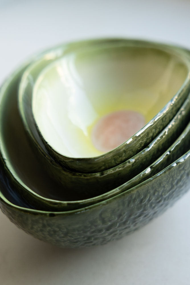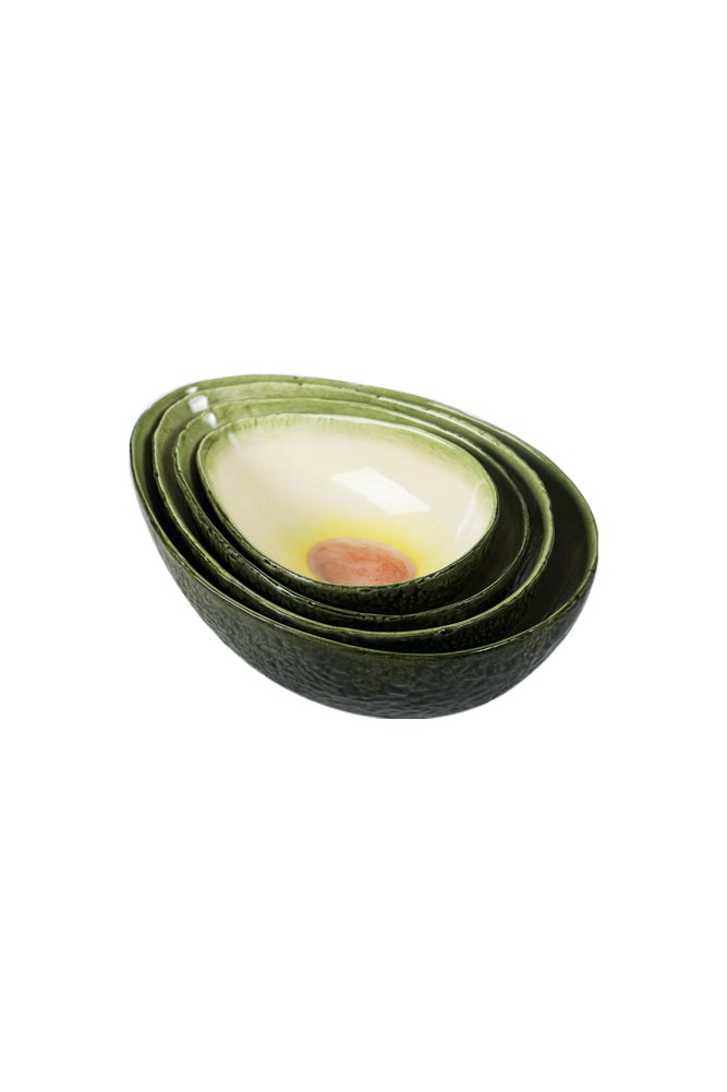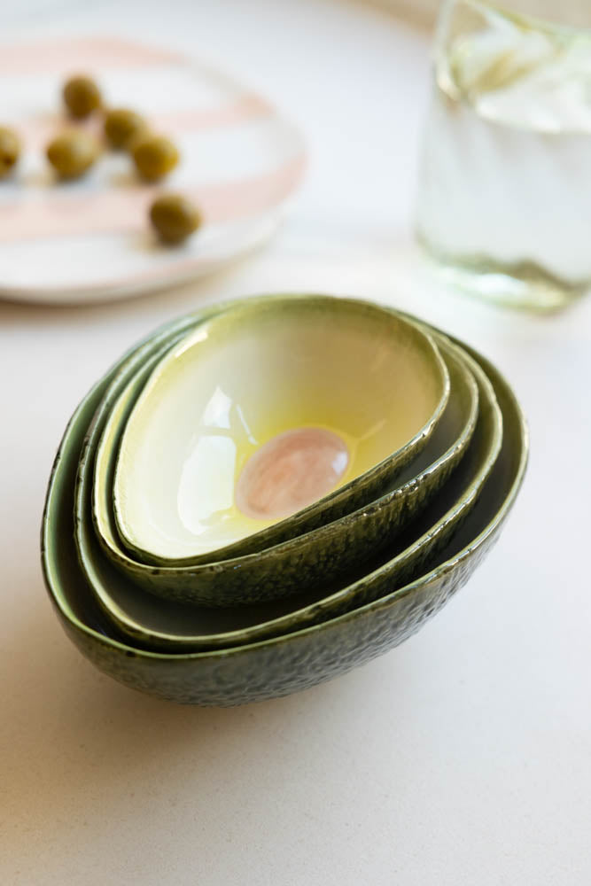 The Set Of 4 Avocado Nesting Bowls takes inspiration from an iconic brunch favourite. Celebrating the power of unique and quirky pieces when styling your table or snack station, the small bowls are perfect for olives, nuts, crips, olive oil, salt or slices of citrus for drinks. Designed in the shape and style of an avocado, each bowl in the set features authentic hand-painted detailing on the inside and a dark green, textured surface on the outside. With four small bowls in the set, the design adds a playful touch to aperitivo hour when entertaining your favourite people for drinks. When not used on the table, the nut bowls can be stacked together and displayed in style on your kitchen shelves.