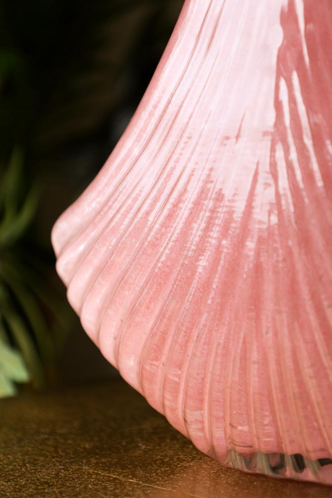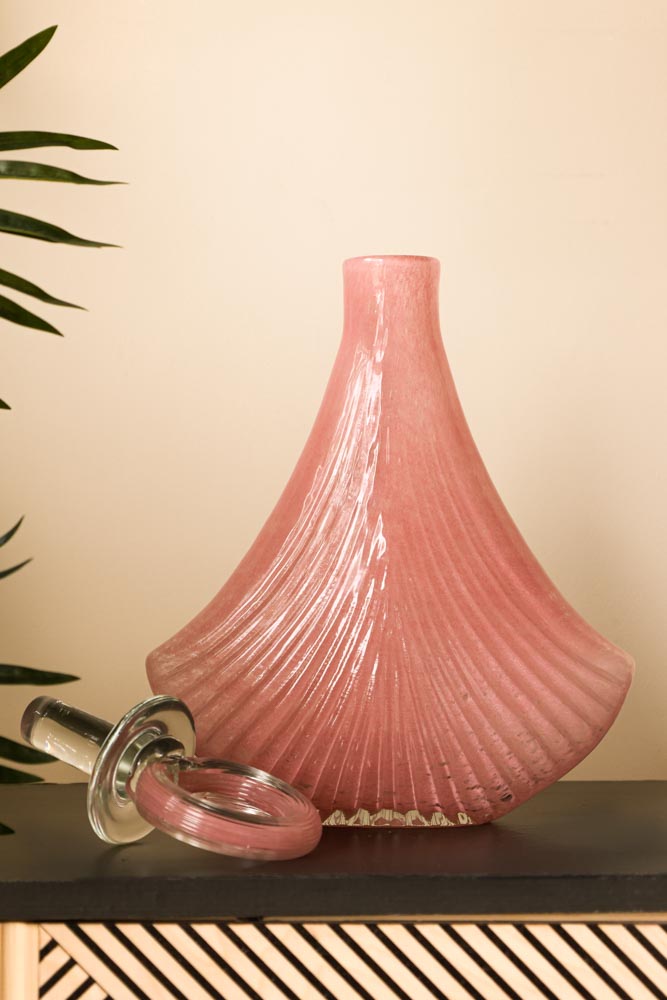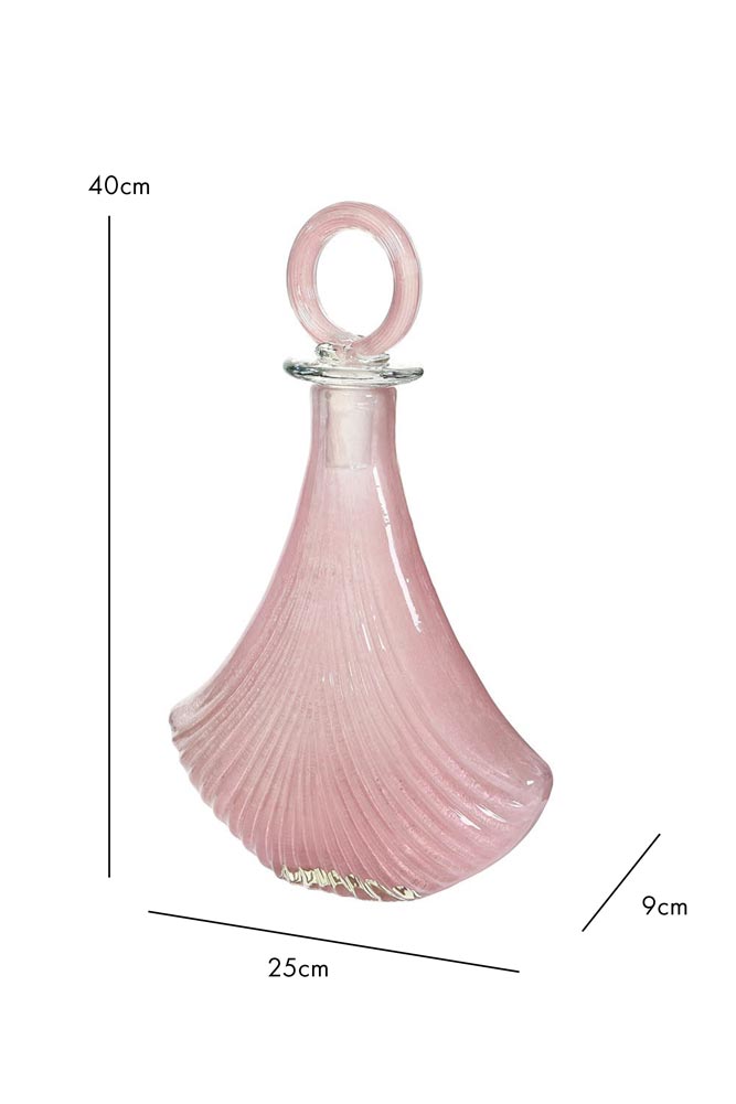 The perfect addition to a girly home bar, the Pink Glass At Deco Decanter is a stunning practical and stylish showpiece. Measuring 40cm in height, 25cm in width and 9cm in depth, this glass decanter showcases an art deco shell-like design in a flirty pink colourway with a bubbly blown glass effect. This glass decanter features a large round stopper that can be used when serving beverages or this stunning piece can be displayed as a unique and quirky vase styled with your favourite florals or foliage.