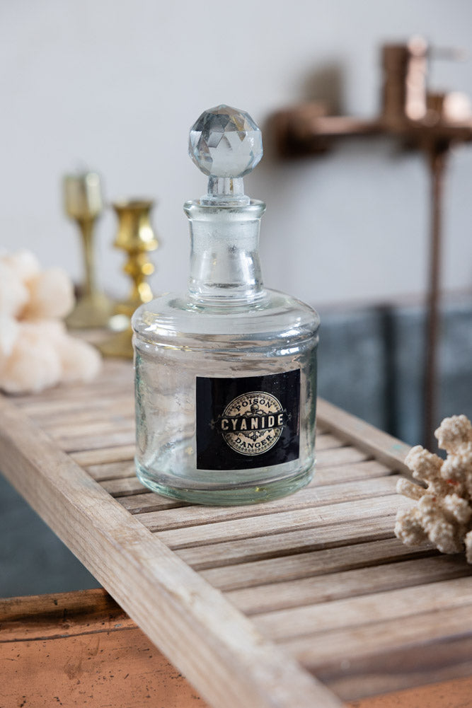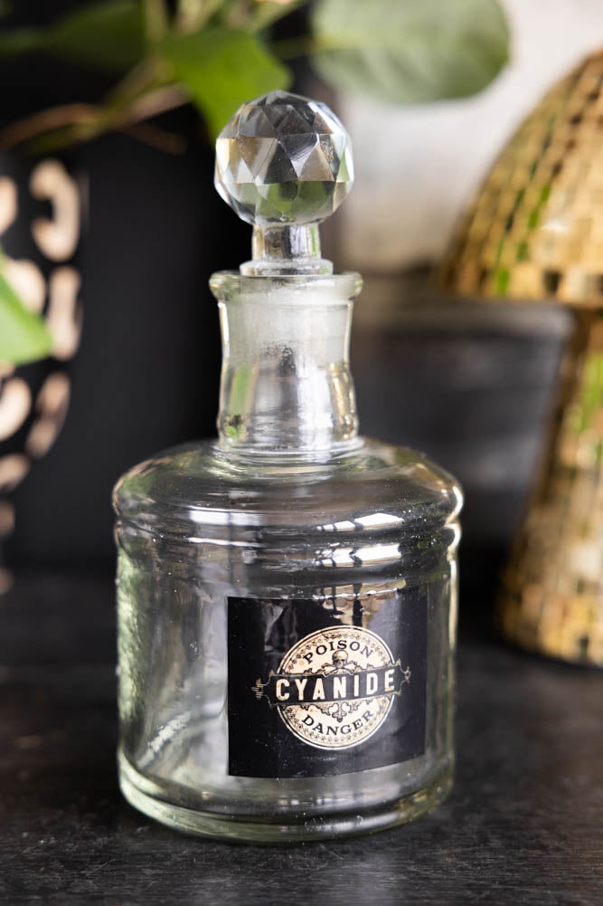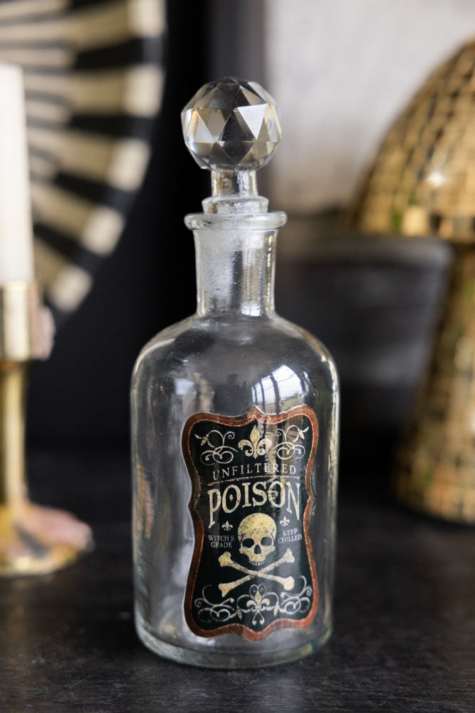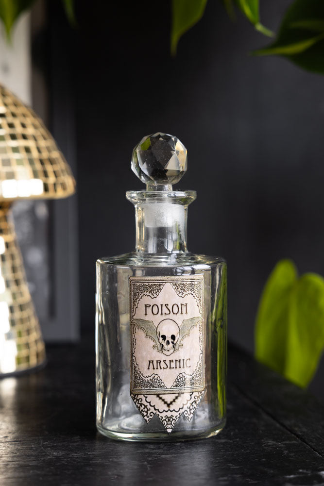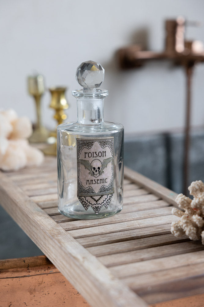 Indulge your dark side with the Set of 3 Apothecary-Style Poison Decanter Bottles. Inspired by vintage apothecary bottles, the decanter set features three chunky glass bottles with glass stoppers and ornate poison labels. A fabulous addition to your bar cart, fill the bottles with your favourite elixirs and create a lethal house cocktail or play a game of spirit roulette. Mysterious and chic with gothic glamour in spades, the bottles can also be used as bathroom accessories to decant Epsom salts and luxury bath soaks into your bath in style.