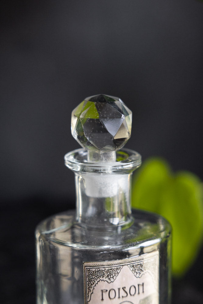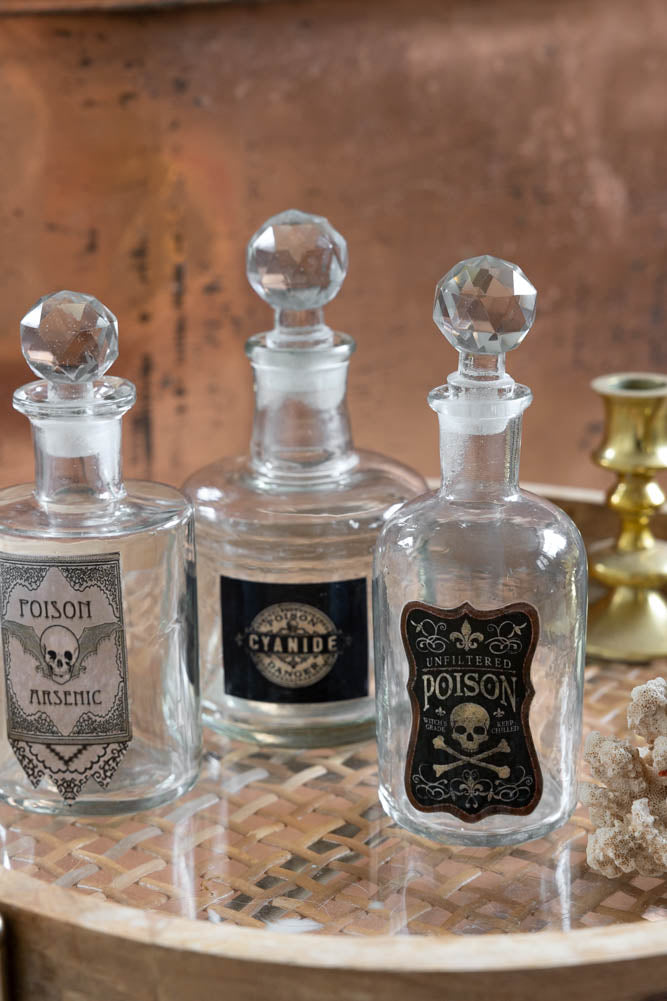 - Set of three apothecary-style decanter bottles with gothic poison labels