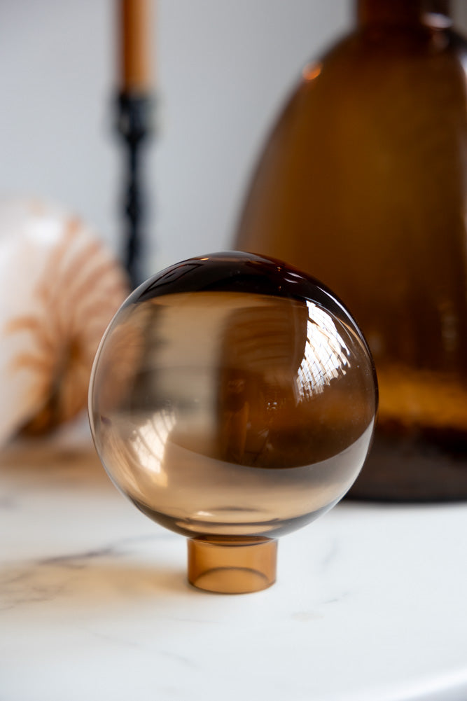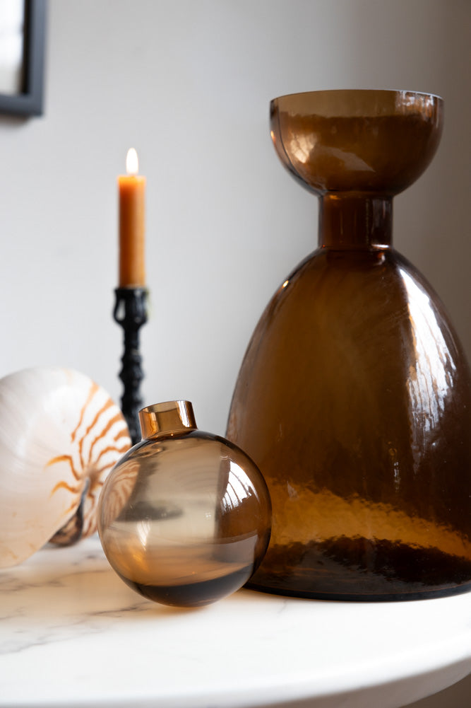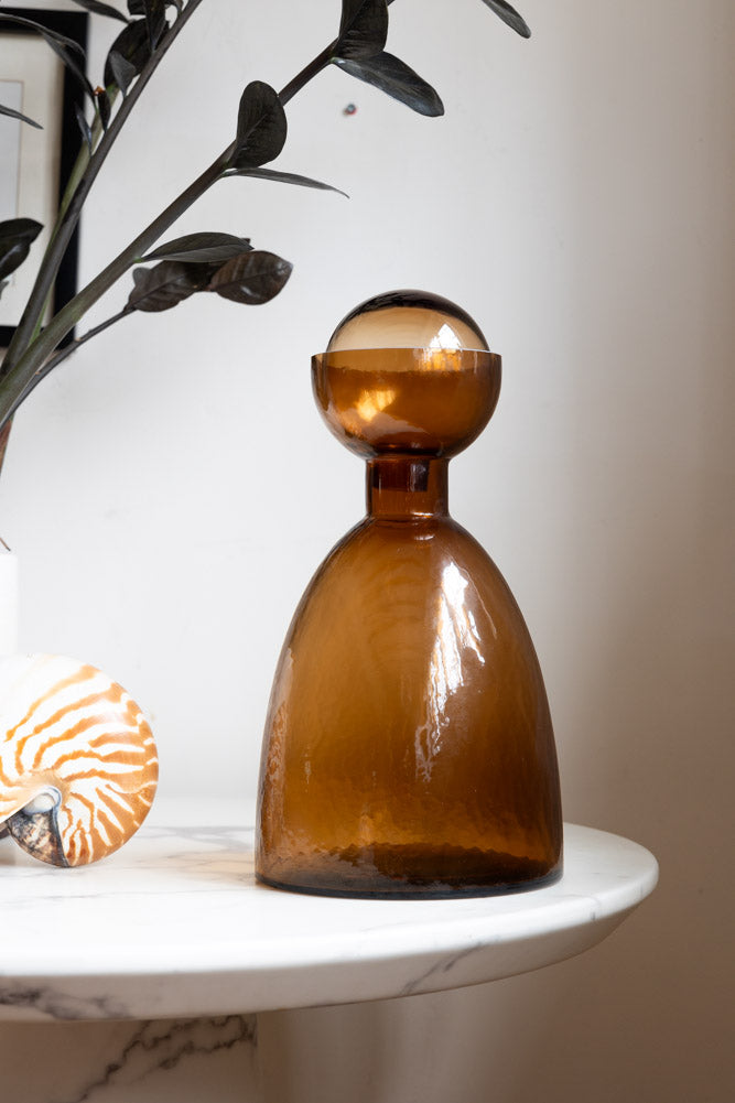 The Amber Smoked Glass Decanter is a charming blend of artistry and practicality, featuring a unique ball lid that slots perfectly into the bottle, creating the most elegant silhouette. The rich bronze hue, coupled with the artisanal craftsmanship offers a rustic appeal to this decorative bottle. Perfect for adding a touch of vintage charm to your space, the bottle’s warm tones create a serene visual impact. Put this Rustic Bottle on a shelf or as a centrepiece on your dining table to infuse your area with timeless elegance. This bottle is a testament to the allure of rustic design, promising to enchant your space with both beauty and utility.