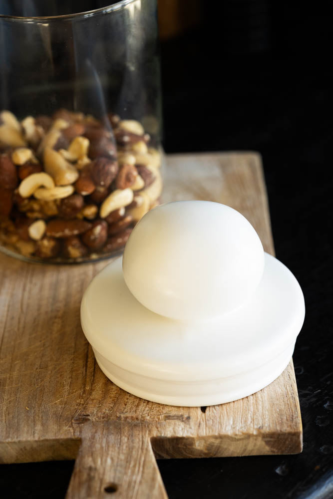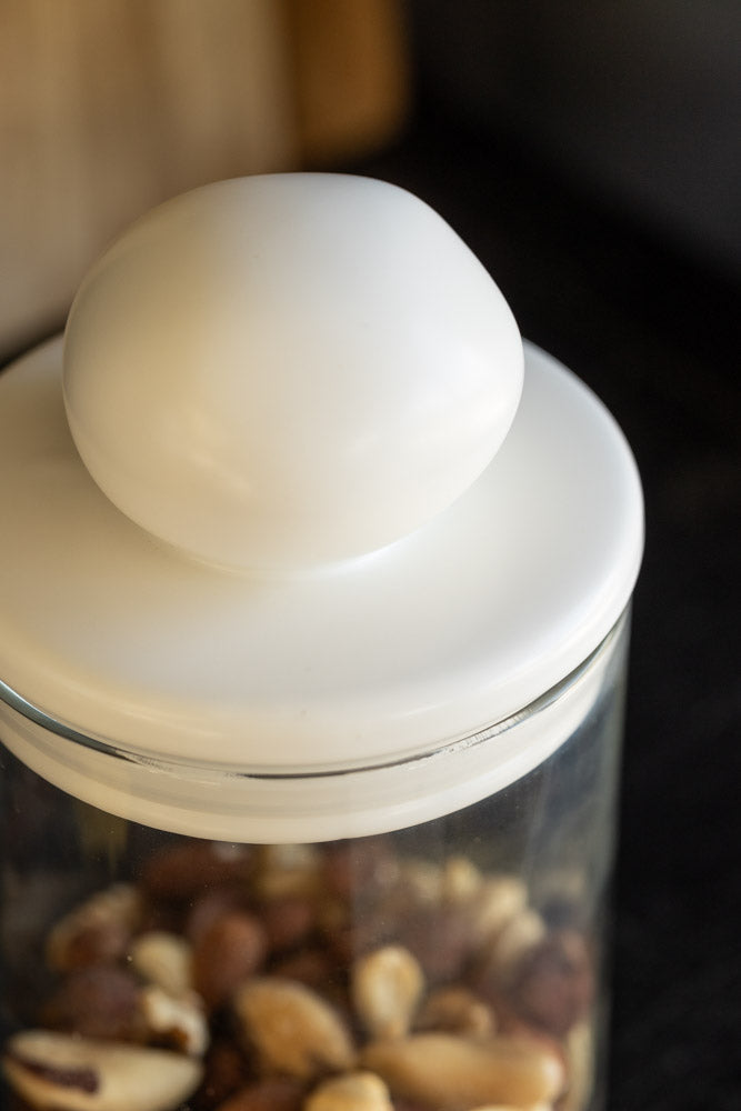 The Small Glass Storage Jar with White Ceramic Lid is perfect for achieving a super-chic minimalist pantry look. A fabulous alternative to plain glass storage jars in the kitchen, this modern design features a ceramic lid in the shape of an organic pebble that you will want to show off on your shelves. Ticking all the boxes, the glass jar is both stylish and practical, with a silicone ring seal that keeps your food box fresh. Perfect for storing pantry essentials, you can keep everything from microbiome-conscious nuts and chia seeds to pasta, tea or coffee in this jar. Alternatively, why not fill it with Oreos to create the coolest cookie jar ever and indulge your monochrome kitchen dreams from shelves to snacking? - Glass storage jar with a white ceramic pebble lid - Measures: H21cm x Dia. 11cm - Holds up to 1000ml - Perfect for kitchen or bathroom storage