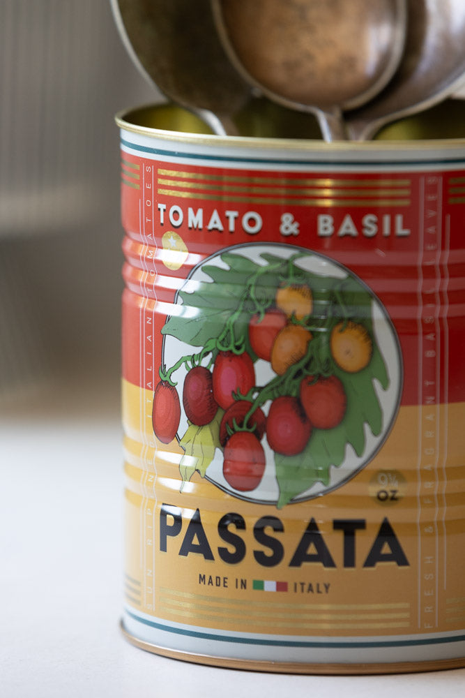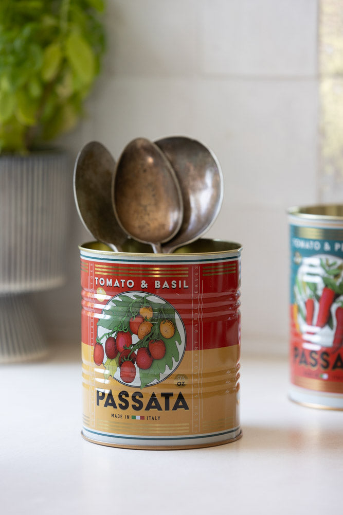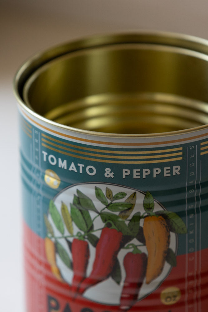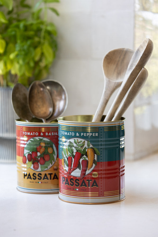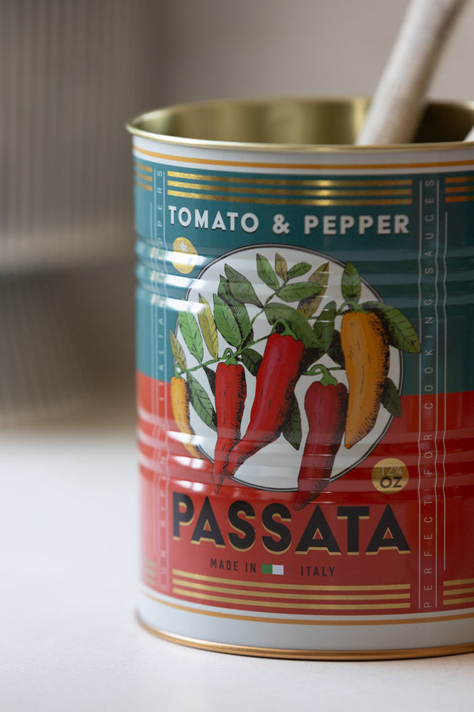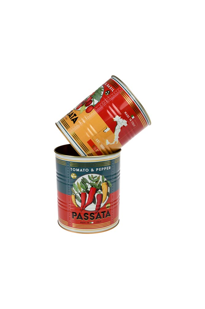 The Set Of 2 Passata Storage Tins offer a quick, easy and affordable way to live out a luxe pantry look on your kitchen shelves. Perfect for storing cutlery or utensils, these stylish storage tins reminded our Co-founder Jane of travelling to the Mediterranean, from Portugal to Italy, and returning home with culinary delights that help recreate magical food memories from holidays. Inspired by the tradition of bringing home foodie treats adorned with beautiful and colourful packaging, the passata tins introduce a nostalgic nod to Italy without taking up valuable space in your hand luggage. It’s a well-known fact of life that tomatoes taste so much better in Italy – and these storage tins celebrate that fact. With a nod to typically chic Italian packaging, the larger passata metal tin includes an illustration of colourful peppers, while the smaller jar reveals tomatoes on the vine. Style yours on an open shelf to introduce a pop of colour to the kitchen, and fill the tins with all the utensils you need to create the perfect pasta al pomodoro.